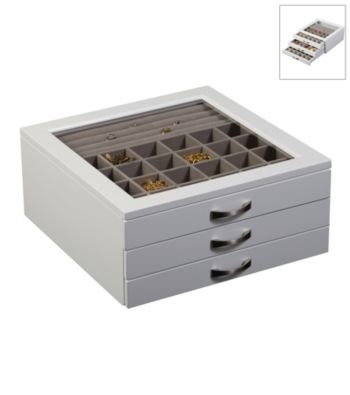 Shop for Jewelry Storage from JewelryBoxes.com! From your day job to your night life the Mele Liza Glass Top White Jewelry Box is designed to accommodate all of your favorite pieces. It all starts with compartmentalized organization slide-out trays and a ring roll so you can customize your storage of bracelets earrings and more. It s finished in classic white with a complementary dark gray suede interior. Additional information: Top tray features 36 sections and a ring roll Middle tray features 24 sections Bottom tray features 2 large sections and 6 smaller sections Nickel-toned hardware and drawer pulls About MeleEmidio Mele an Italian immigrant to the United States came to New York City in 1896 and learned to make jewelry boxes as an apprentice before founding Mele Manufacturing in 1912. He began by designing and building elegant displays for jewelry store windows. His jewelry box-making business grew throughout the 1900s responding to demands for boxes to hold Purple Hearts during WWII and developing as a popular household name for quality jewelry boxes. Today Mele Jewelry Box is known as the Mele Companies which encompass various divisions under the Mele name. Now based in Utica N.Y. Mele still upholds the family atmosphere on which it was founded and remains America's foremost name in jewelry cases.