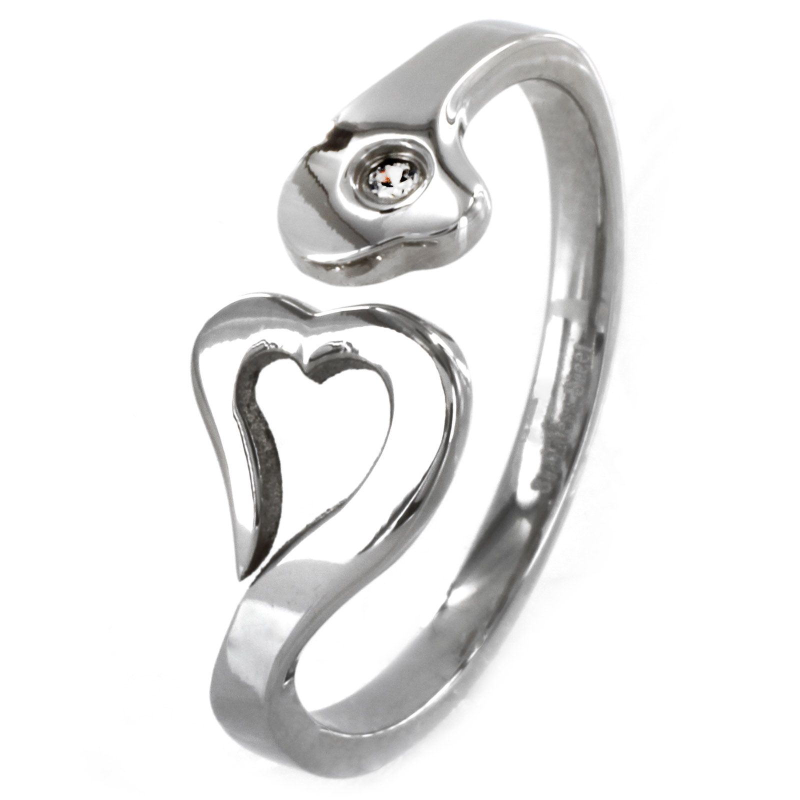 This sweet promise ring features an open heart ring and an abstract heart with center cubic zirconia. Show your love and commitment with this pretty ring. Features: -Ring. -One Bezel-set round-cut cubic zirconia. each measures 1.5mm wide. -Hypoallergenic stainless steel for someone whose skin is sensitive to metal. -Scratch resistant, it is lower than titanium, or tungsten. -Metal will not tarnish or rust. Specifications: -Gemstone weight: 0.023 Carats. -Band dimensions: Tapers from 7mm wide to 2mm wide x 1.3mm thick. -Ring front dimensions: 7.11mm H x 13.97mm W.