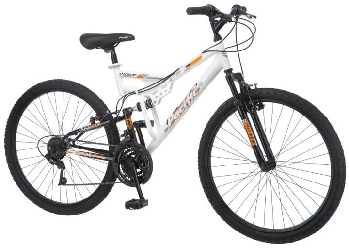 Rugged and ready for a day on or off road, the Pacific mountain bike in Chromium is great for riders looking for both fun and adventure. This Pacific mountain bike features a dual suspension frame, 18 speeds, Tourque drive shifters and a 3-piece mountain crank. The Chromium is ready to take you on your next ride. anywhere, anytime. 3-Piece MTB crank offers wide gear range to suit any terrain Wheel size: 26-inch Pacific Warranty: Frame- Five Years, Parts- One Year, Wearable Parts- 30 days Pacific 26" Men's Chromium Mountain Bike: Steel suspension frame maximizes comfort and performance Suspension fork makes bumps smooth and increases control Torque Drive twist shifter changes gears quickly 18-Speed Torque Drive rear derailleur for easy shifting Steel linear pull brakes stop precisely 3-Piece MTB crank offers wide gear range to suit any terrain Quick release seat for fast and easy height adjustments Durable steel wheels Wheel size: 26-inch Part #: 264162PB Color: White Pacific Warranty: Frame - Five Years, Parts - One Year, Wearable Parts - 30 days
