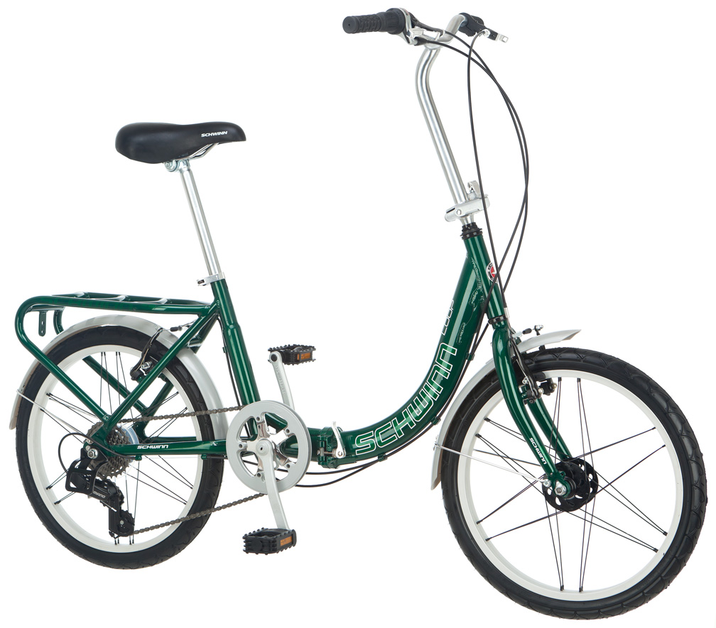 Schwinn 20 Inch Loop Folding BikeThis bike has everything you are looking for in an easy to transport fun to ride folding bike. The Loop Folding Bike features an alloy super low stand over folding frame build in rear carrier fenders alloy rims and a heavy gauge nylon carrying bag. This bike comes equipped with a folding steering column with integrated handlebar alloy front and rear linear pull brakes 7 speed Shimano grip shift shifting and 20 alloy rims and city tires.